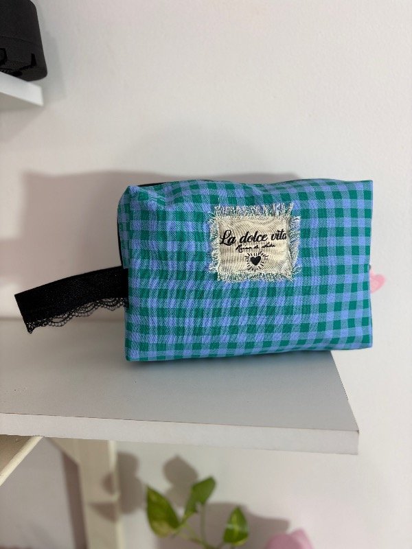 Pouche Vichy en color verde y turquesa , con detalles de encaje , por dentro está forrado en Silver negro.