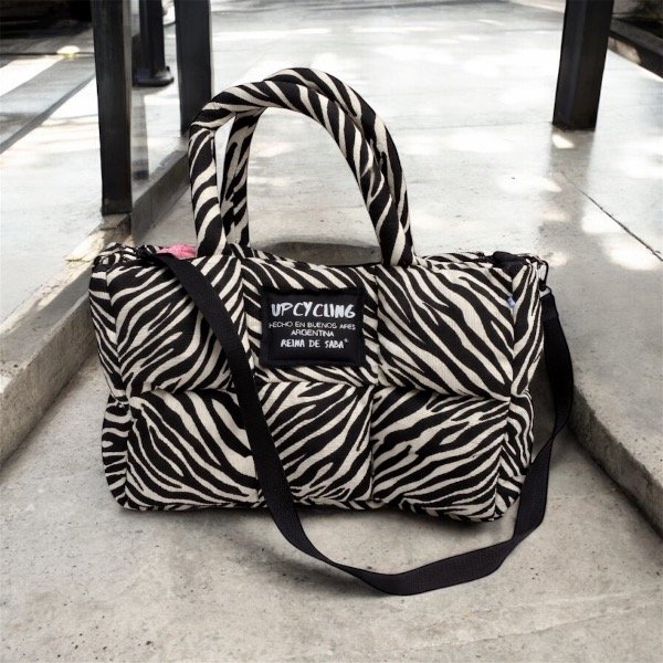 Puffer Bag Cebra, está hecha en tela estampada rellena con guata, su interior es de silver negro.