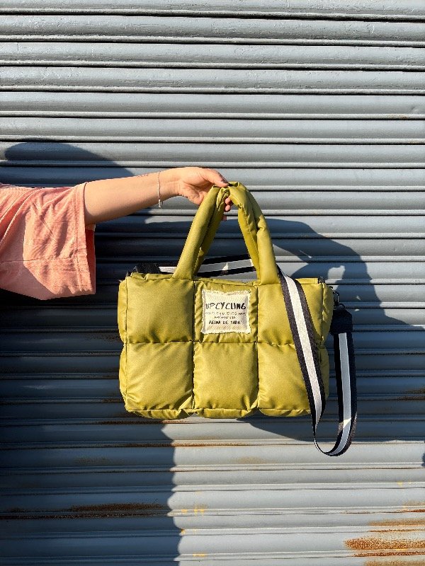 Puffer Bag Oliva 🫒, está hecha en Ecocuero verde relleno con guata, su interior es de silver negro.