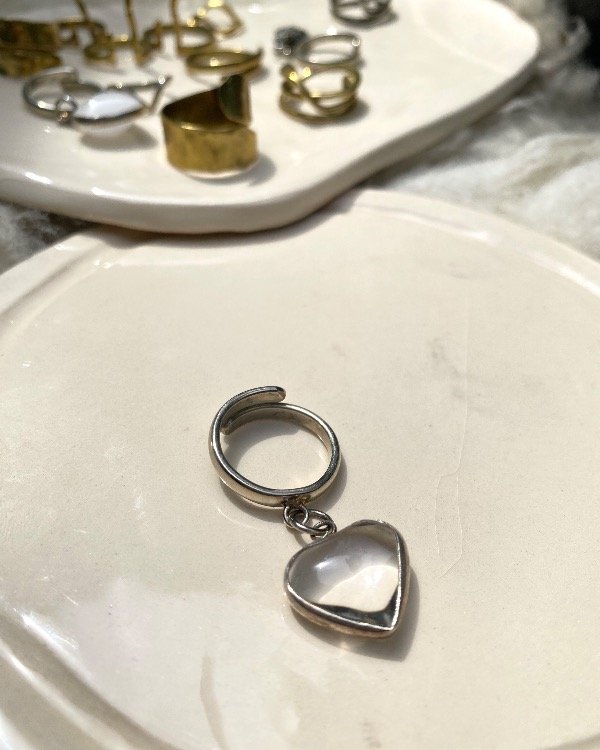 Anillo de alpaca regulable con dije de corazon con cuarzo cristal , no se oxida ni pierde color. Para limpiarlo podes usar un paño .