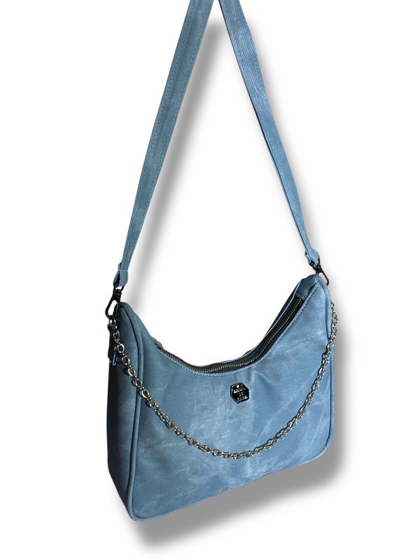 Mini bag Nova hecha en Ecocuero símil Jean claro. Tiene correa azul marino , es desmontable.